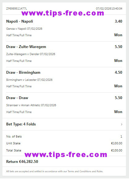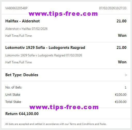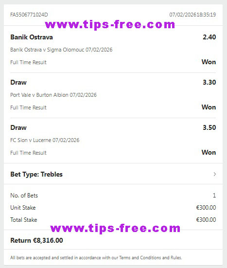 is is the best betting online site who have fixed matches 100% sure. Above all Tips Free is serious team with 10 agents all over the world with 10 years of experience to be sure that matches are sure and strong. Also we have ticket proof from oficial online betting site bet365.com no lie no scamm. Of course also we have free daily tips low odds, they are our analysis. We are in contact with agents from clubs because matches are sure and strong. To be sure we know form from club and players, whether and when will be fixed or manipulated maches.